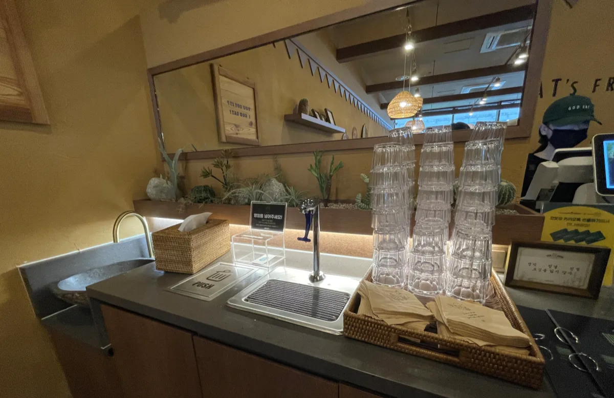 주문을 하고 기다리는 동안 계산대 옆 셀프바에서 물을 떠 올 수 있어요.
