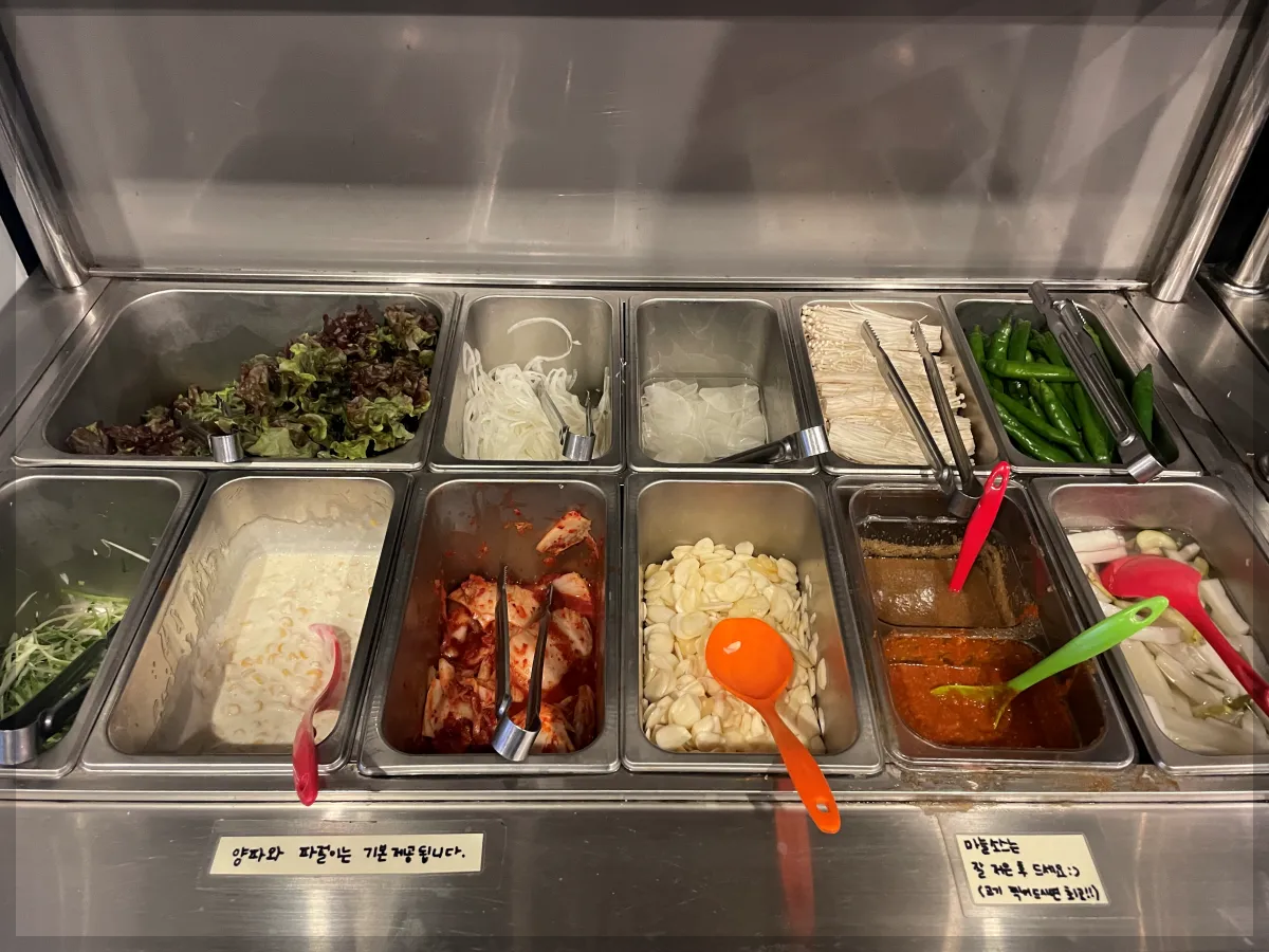 셀프바에 가면 다양한 사이드 메뉴가 있습니다. 기본적인 야채와 반찬류가 있는데, 아주 깔끔하게 진열되어 있었습니다.