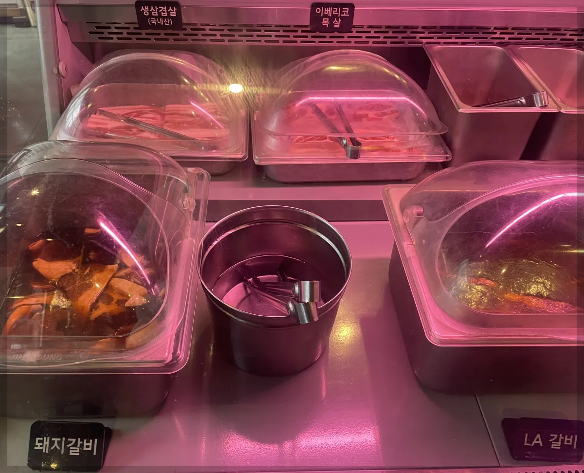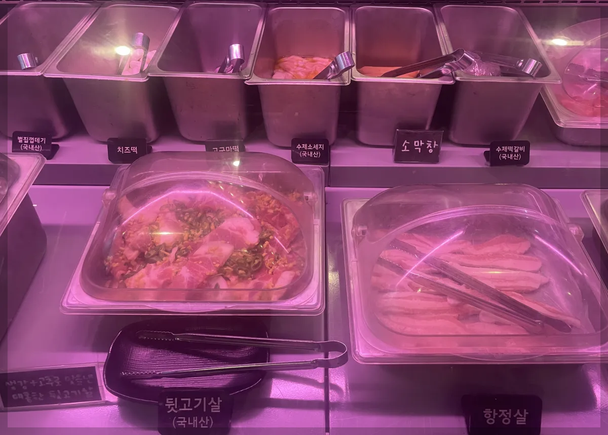 냉장고 위쪽에 고기 등급이 프라임이라고 표시되어 있었는데, 무한리필치고 꽤 높은 편인 거 같아서 기대가 됐습니다. 실제로 냉장고에서 고를 때 보니까, 핑크색 불빛 때문에 조금 알쏭달쏭하기는 해도 고기 질이 상당히 괜찮아 보였어요.