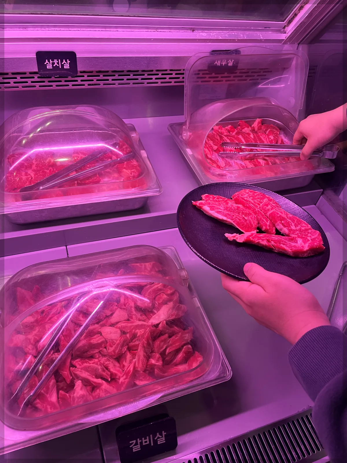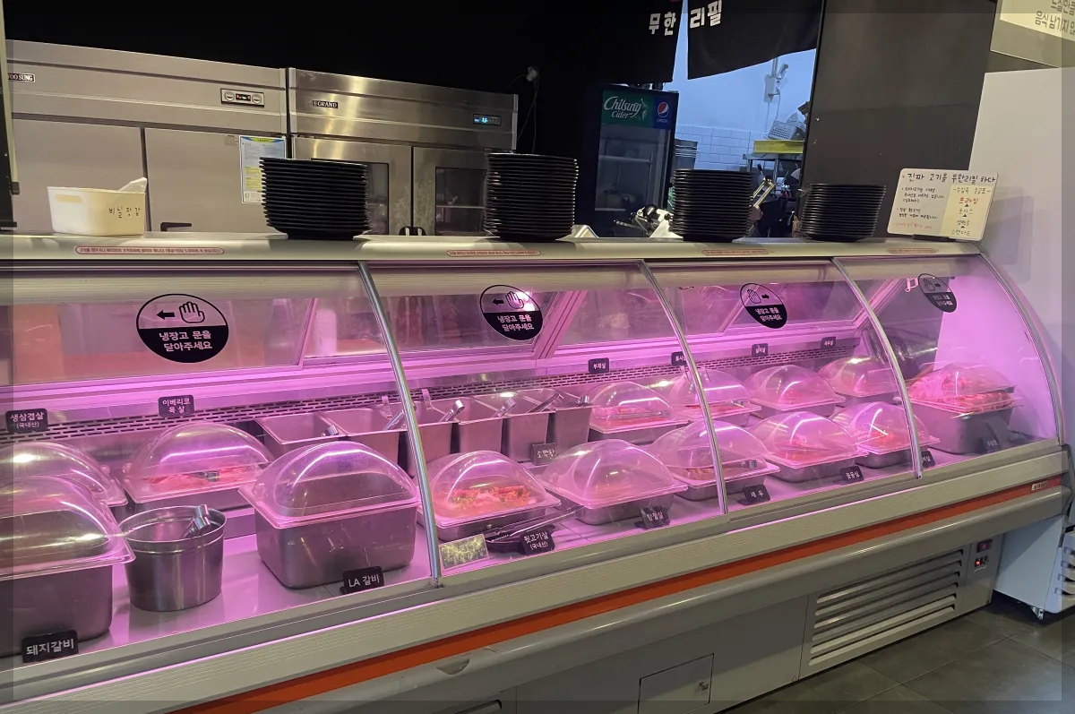 냉장고 위쪽에 고기 등급이 프라임이라고 표시되어 있었는데, 무한리필치고 꽤 높은 편인 거 같아서 기대가 됐습니다. 실제로 냉장고에서 고를 때 보니까, 핑크색 불빛 때문에 조금 알쏭달쏭하기는 해도 고기 질이 상당히 괜찮아 보였어요.