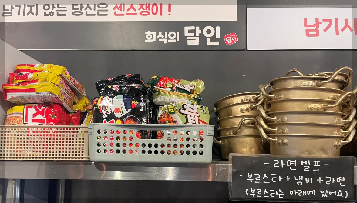매우 마음에 들었던 사이드메뉴 중 하나는 라면이었습니다. 진라면만 있는 게 아니라 불닭볶음면과 짜파게티까지 있었거든요. 라면 맞춤용 양은냄비까지 있으니 저희도 그냥 지나칠 수는 없었어요. 저희는 4명이었지만 고기때문에 배가 많이 불러서 진라면 하나만 끓여 먹었는데요. 단체로 온다면 라면 여러 종류를 끓여서 같이 나눠먹기 너무 좋을 거 같아요.