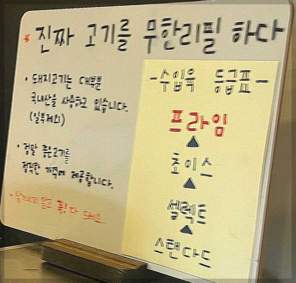 보통 고기 무한리필이라고 하면 고기의 퀄리티가 떨어질거라는 인식이 있는 것 같아요. 저조차도 음식의 질보다는 양이 중요했던 학생 때는 고기 무한리필을 자주 애용했지만, 소화력이 약한 어른이 된 후부터는 기피해 왔었습니다.